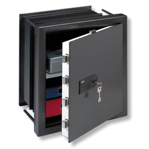 Változtatható mélységű faliszéf kulcsos zárral, EN 1143-1 szerint 0 biztonsági kategória, DIN 4102-A1 szerinti tűzálló szigetelés, tűzvédett ajtóval.