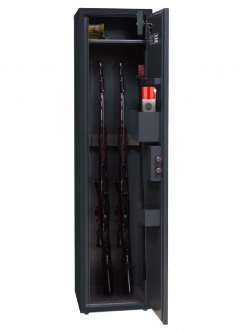Edzett acélból készült kulcsos fegyverszekrény, 4 darab puska elhelyezésére alkalmas belső töltény lőszer tárolóval.
